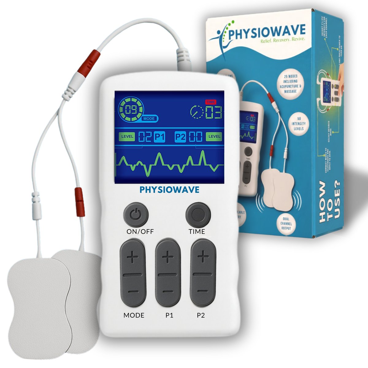 PhysioWave Relief PRO combines TENS and EMS therapy in a rechargeable, palm-sized device with 25 modes and 50 intensity levels — the same technology your physiotherapist uses, now yours to keep.